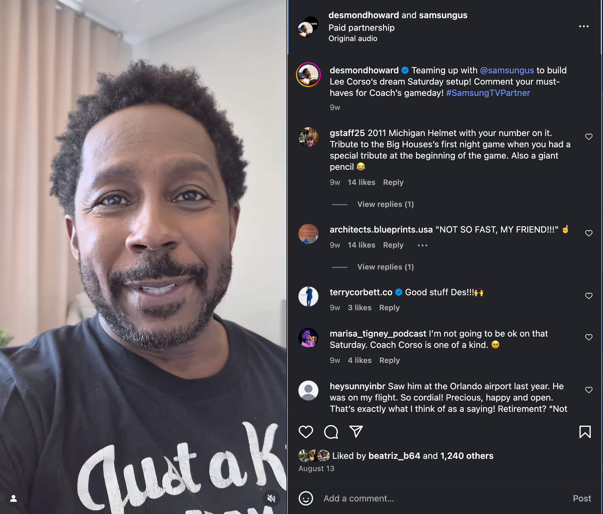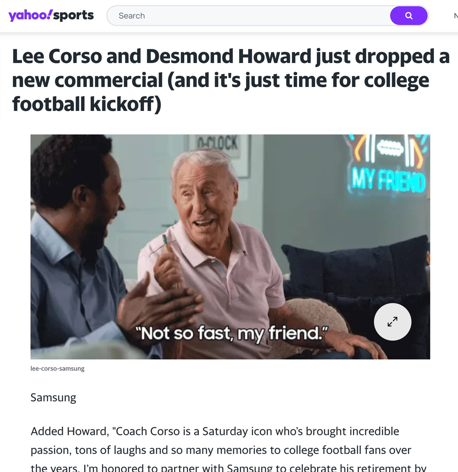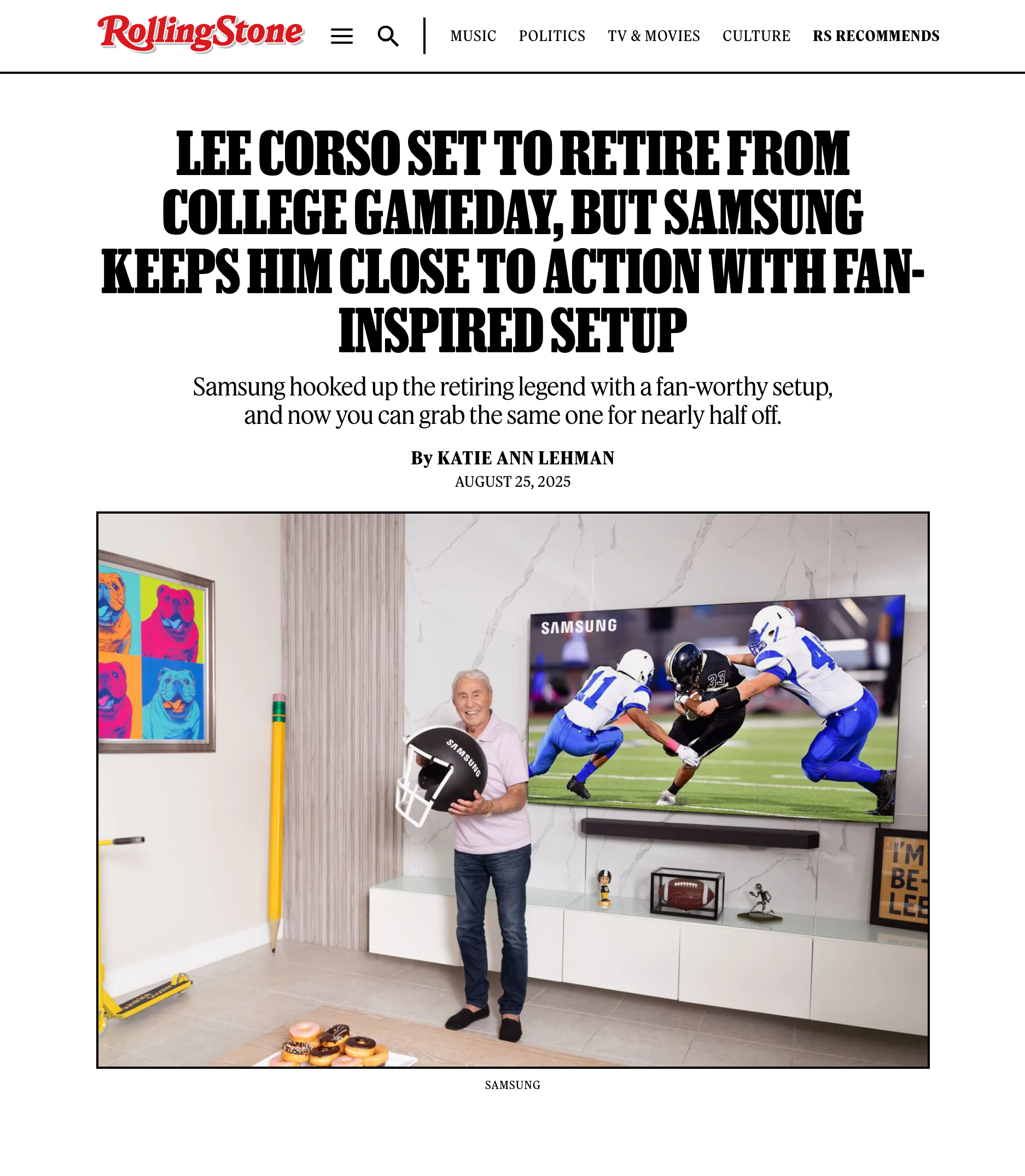 THE IDEA: PHASE 1 — SET THE STAGE FOR A COLLEGE FOOTBALL ICON WITH FAN CTAS & EMBARGO OUTREACH — We seized upon this once-in-a-generation moment to solidify Samsung as the only TV that can keep Lee Corso in the game — even from his couch. And who better to set up Lee's perfect retirement pad than his loyal fans? We worked with Lee's co-host Demond Howard to solicit fan suggestions about what should go into his at-home game-day setup and then surprised the new retiree with a setup filled with memories and inside jokes from his storied career, plus the all-important, big screen TV.